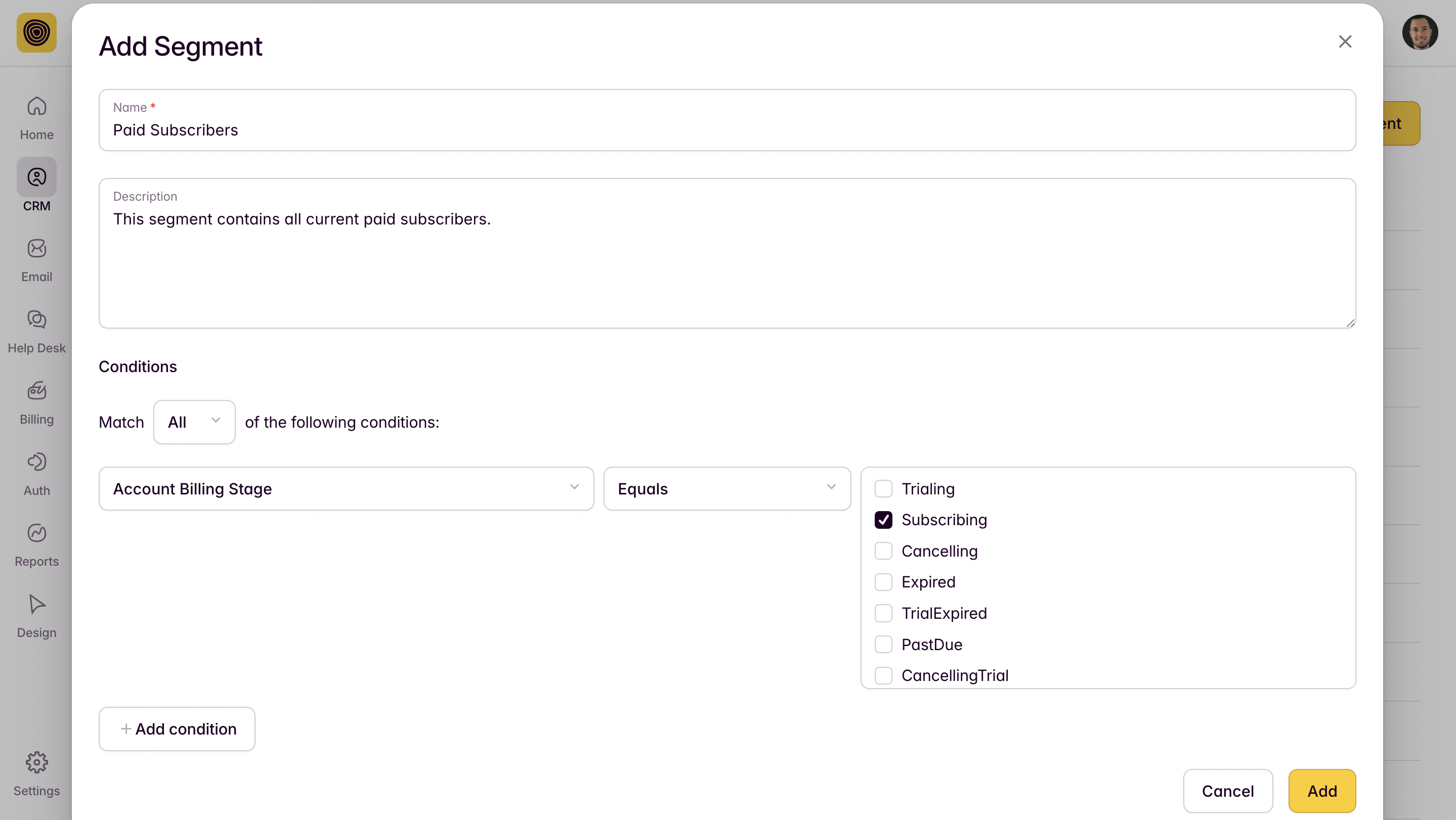 Segments are groups of people or accounts that share similar characteristics. You specify criteria for your segments, then Outseta will automatically populate your segments with any users that match your conditions. Segments can then be used to trigger email campaigns.