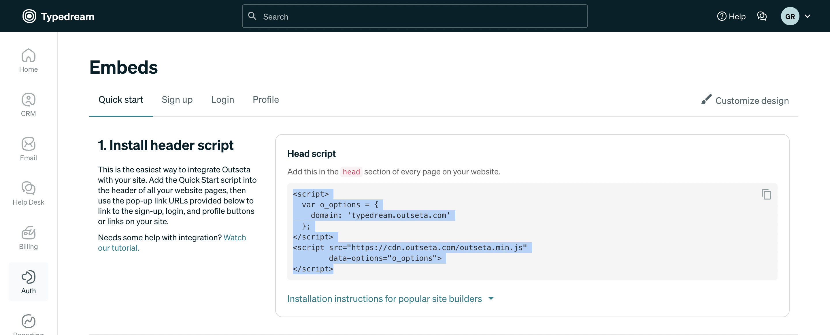 1. Within Outseta, go to AUTH > EMBEDS and copy the Quick Start embed script.