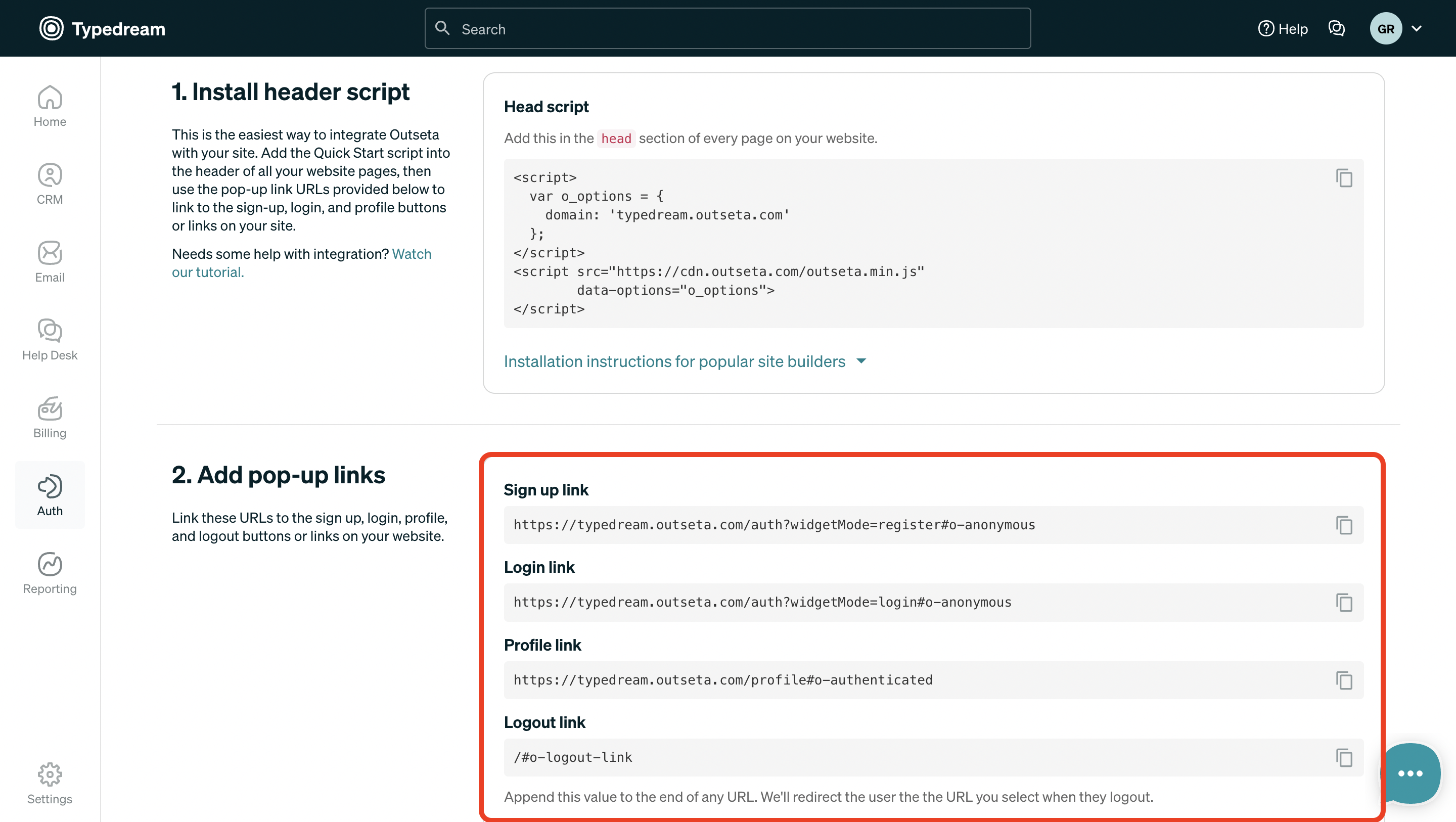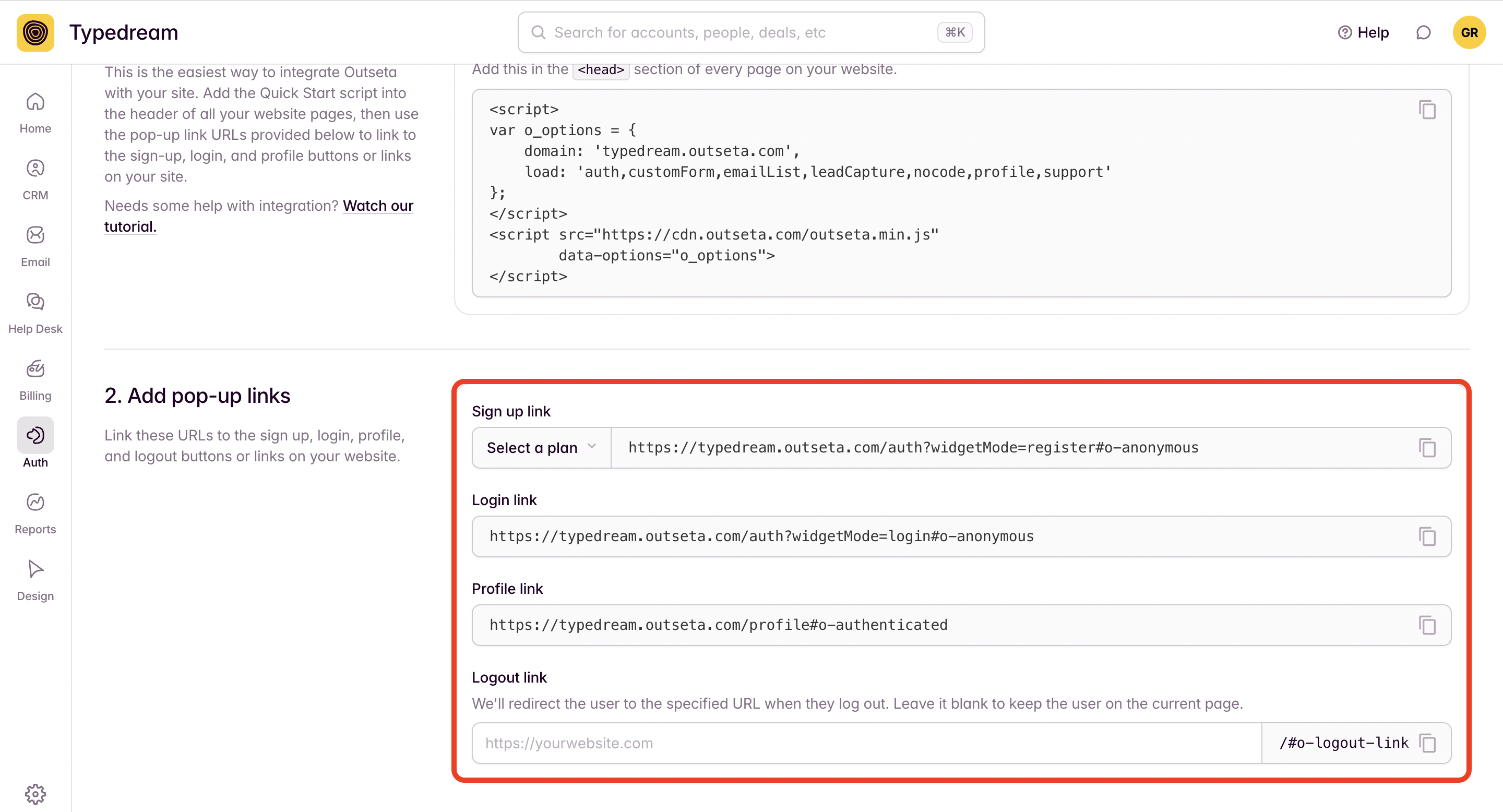 Once you've taken these steps, you're ready to integrate Outseta with your Typedream site.