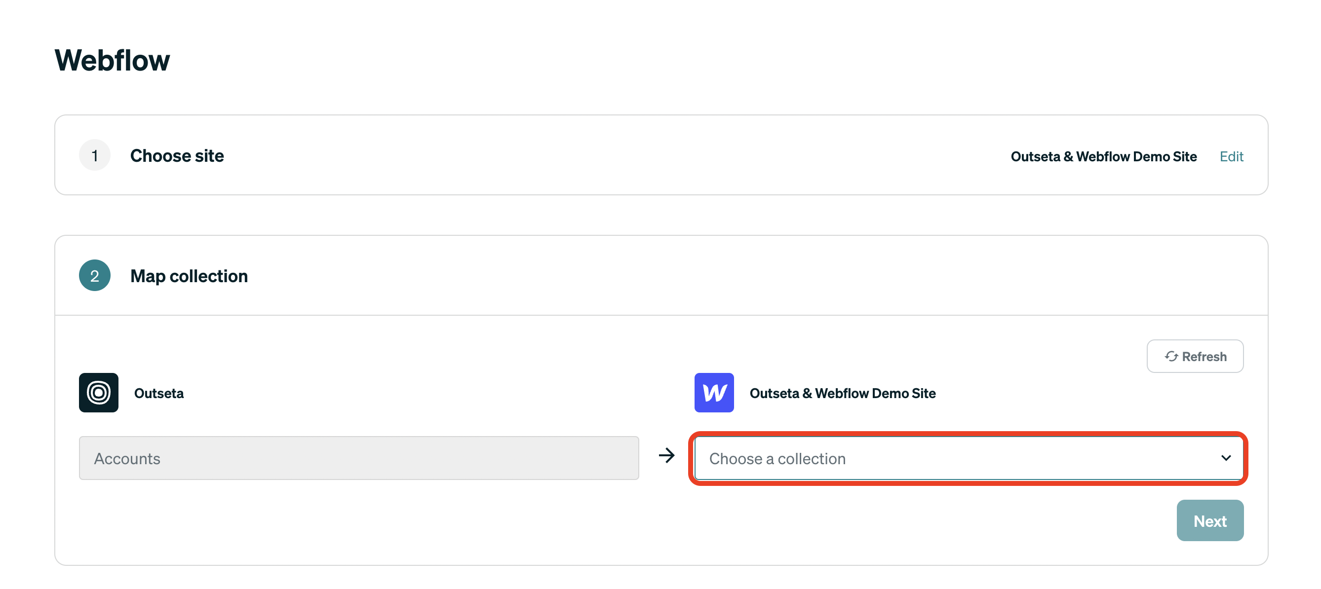 4. Next, choose your Webflow site again and then map your Account records in Outseta to a specific CMS collection in Webflow—this should be the same folder or collection specified in the first step.