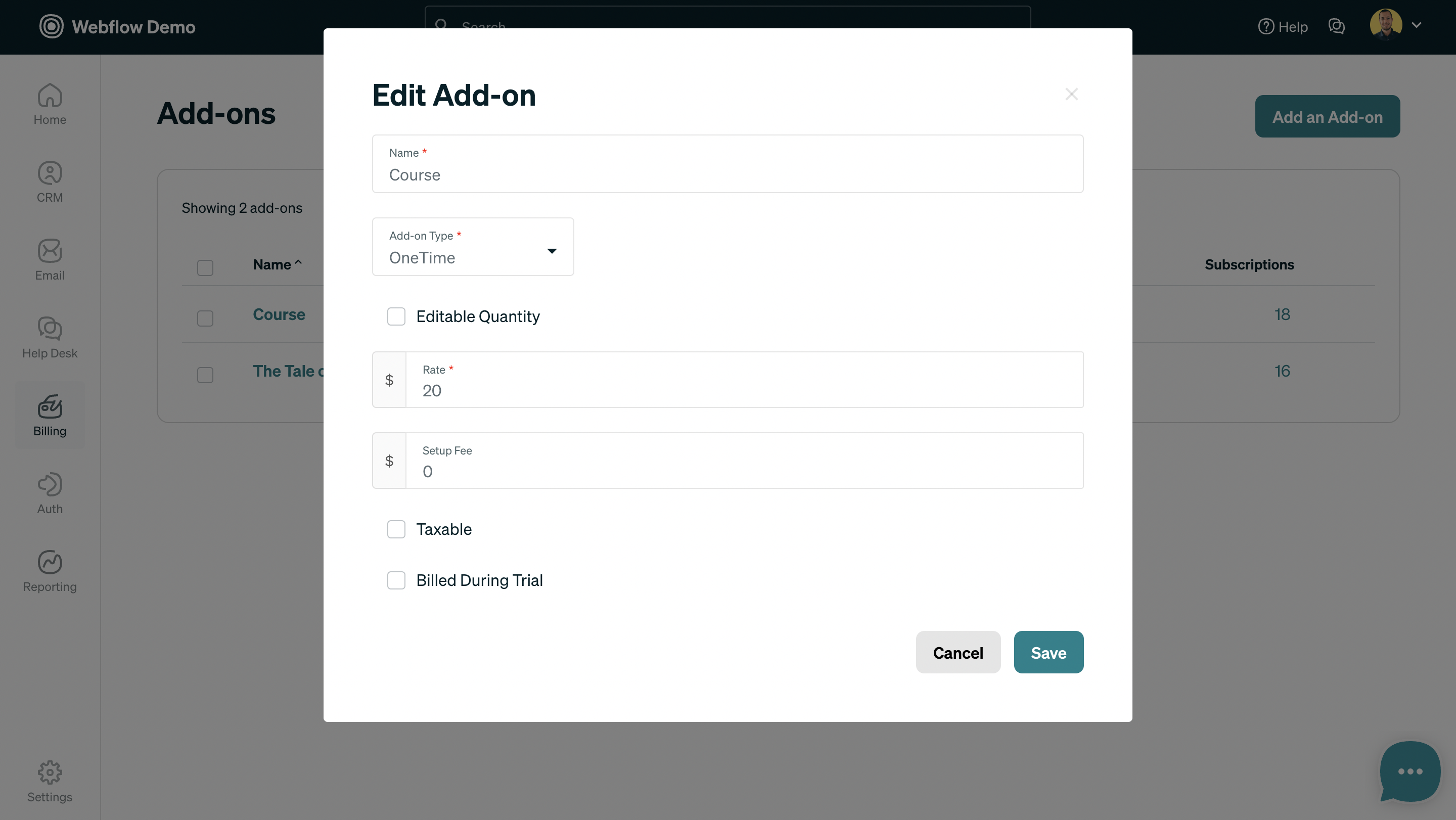 Go to BILLING > ADD-ONS to and click ADD ADD-ON. In the example below, I've setup a one-time fee add-on product for a course that is $20.