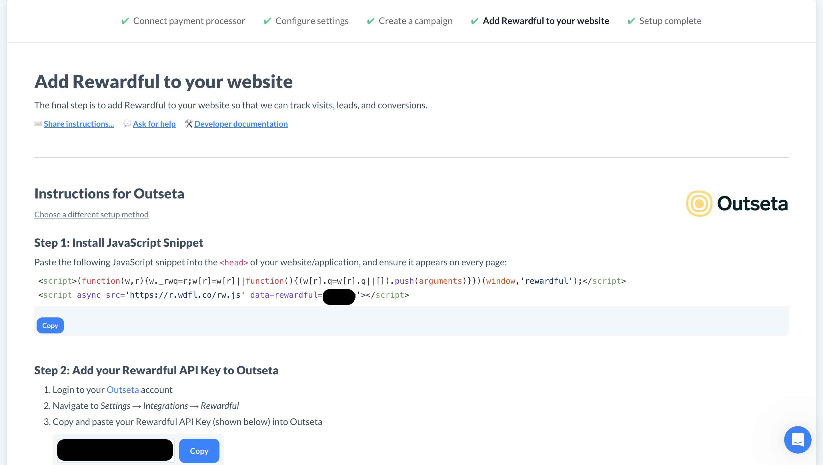 5. Enter Rewardful's API key into Outseta on the SETTINGS > INTEGRATIONS > REWARDFUL page.